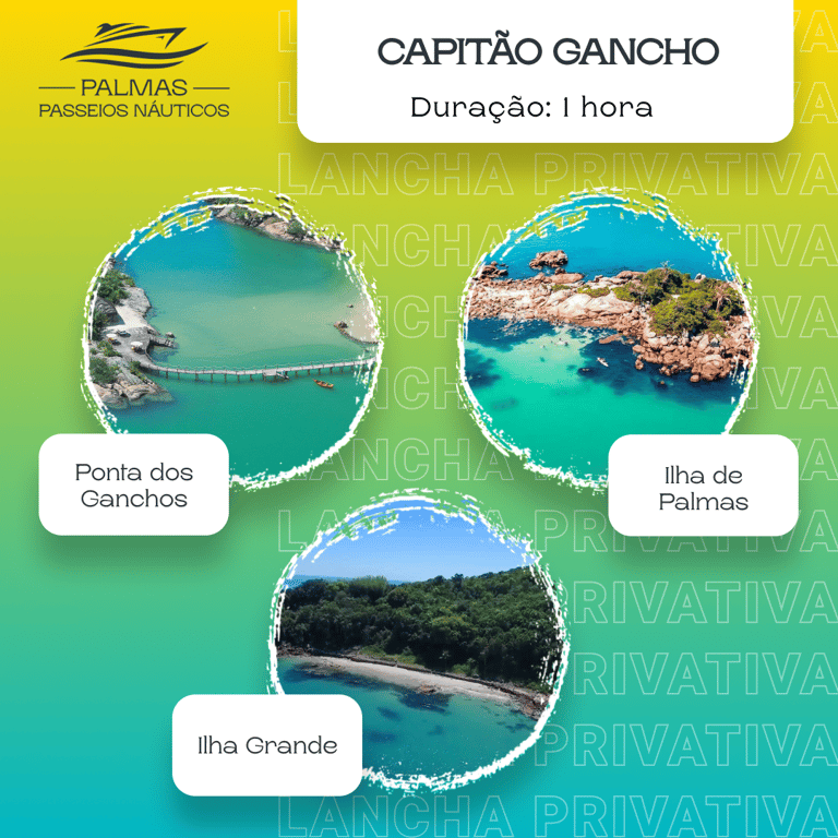 No roteiro CAPITÃO GANCHO você terá a oportunidade de explorar as águas cristalinas da Ilha Grande, a Ilhota de Palmas e ainda de deslumbrar com a Baía de Ganchos, cenário do mais belo por do sol de Governador Celso Ramos.
