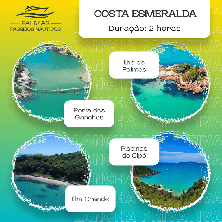 No roteiro COSTA ESMERALDA você terá a oportunidade de explorar as águas cristalinas da Ilha Grande e Piscinas Naturais do Cipó, a Ilhota de Palmas, as praias do Sissial e Ilhéus e ainda de deslumbrar com a Baía de Ganchos, cenário do mais belo por do sol de Governador Celso Ramos.